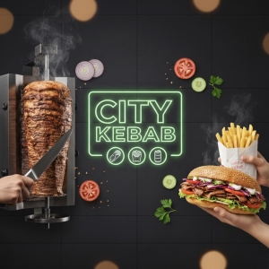 Hähnchen/Kalb Dönerfleisch vom Drehspieß, mit frischem Eisbergsalat, Tomaten, Gurken, Zwiebeln und hausgemachter Joghurtsauce im ofenfrischen Fladenbrot. Mit Pommes und ein Alkoholfreies Getränk